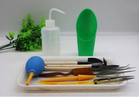 工具:镊子、小铲、浇水器、多肉植物,土壤,轻石,花盆,装饰物