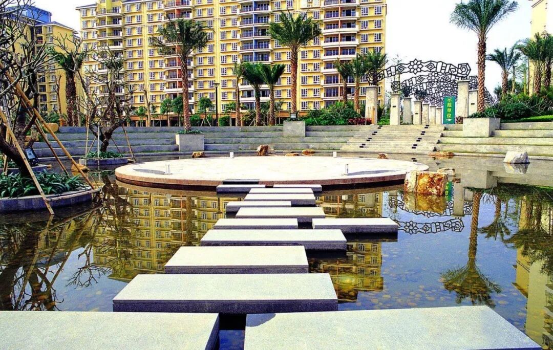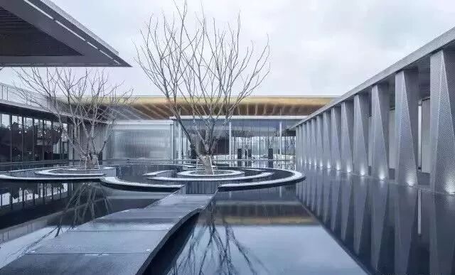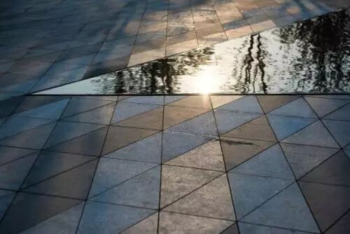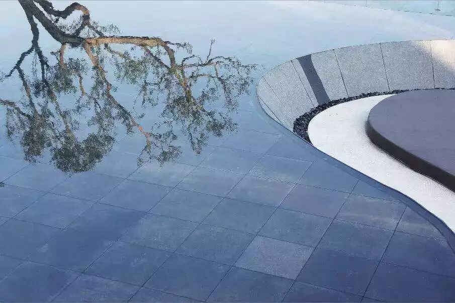 目前,镜面水景主要运用在房地产的售楼部、大型城市综合体的的公共空间设计中。我们常见的镜面水景是运用福鼎黑等石材来打造池面,增加镜面感,营造倒影斑驳的效果。