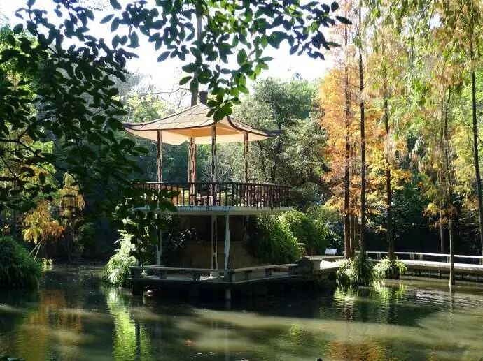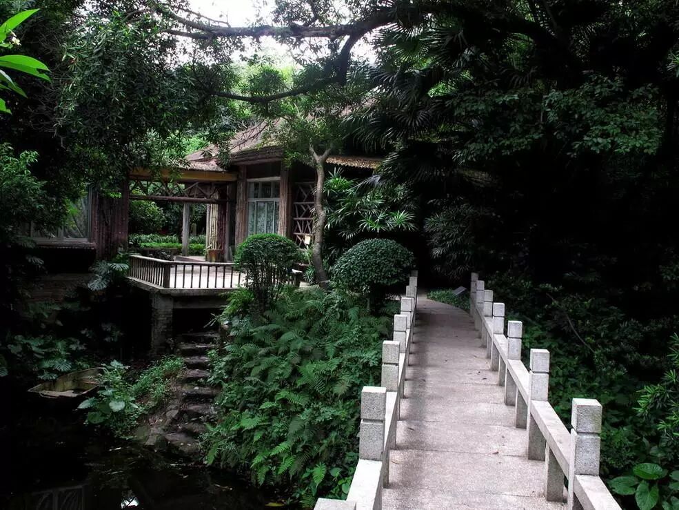 走出兰花园,再弯弯曲曲地绕回园路上,不一会就能见到一家茶室。园中宁静祥和,园外车水马龙。在这环境下品一壶茶,欣赏园内的山水花木,真可谓“偷得浮生半日闲”。