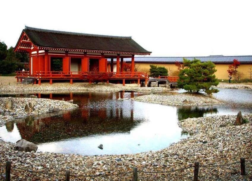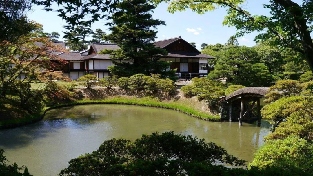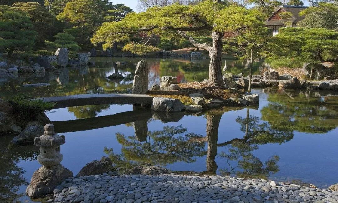 曲折的岸路,灵动的池塘、石组组成了这幅丰富多彩的画面。桂离宫中的“回游式池泉”“特色茶室”都是日本园林的典型代表。