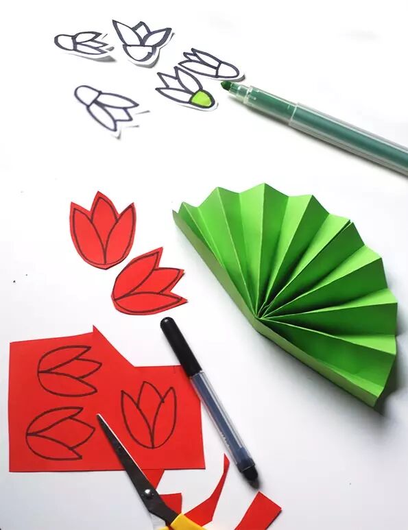 按照上面花圃的步骤,将彩色卡纸折成扇子形状