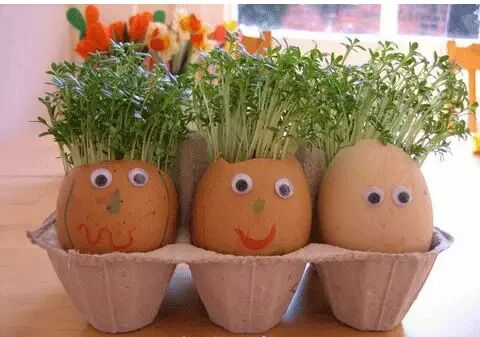 在蛋壳里撒上比较容易发芽的种子,比如大豆,也可以直接移植小型植物进去