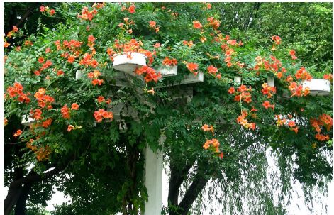 可攀援于凉棚上,花期长,初夏红橙色的花朵累累成串,