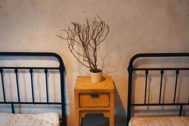 客房里两张铁艺床,
