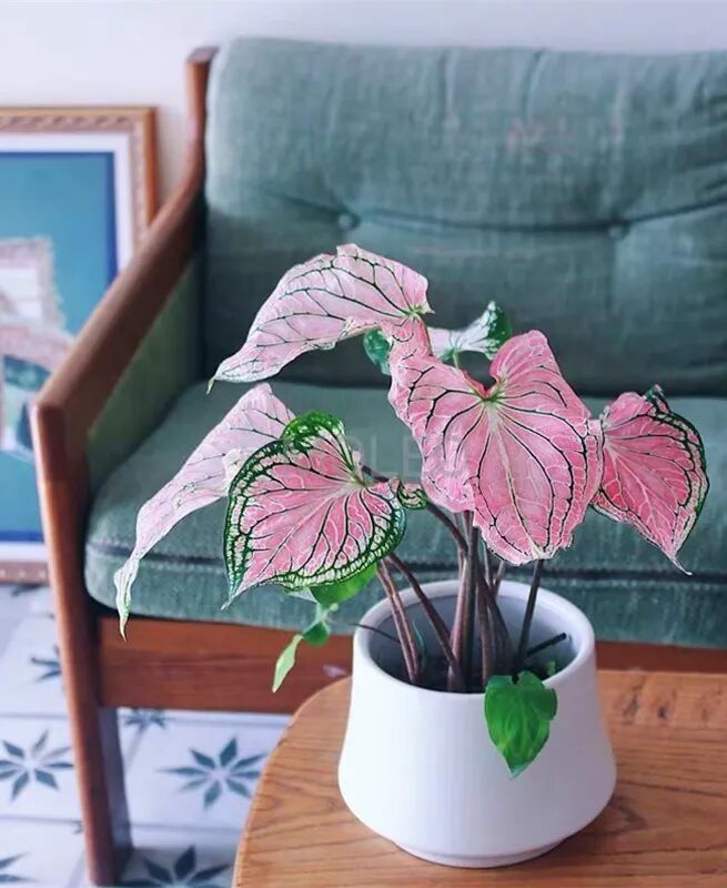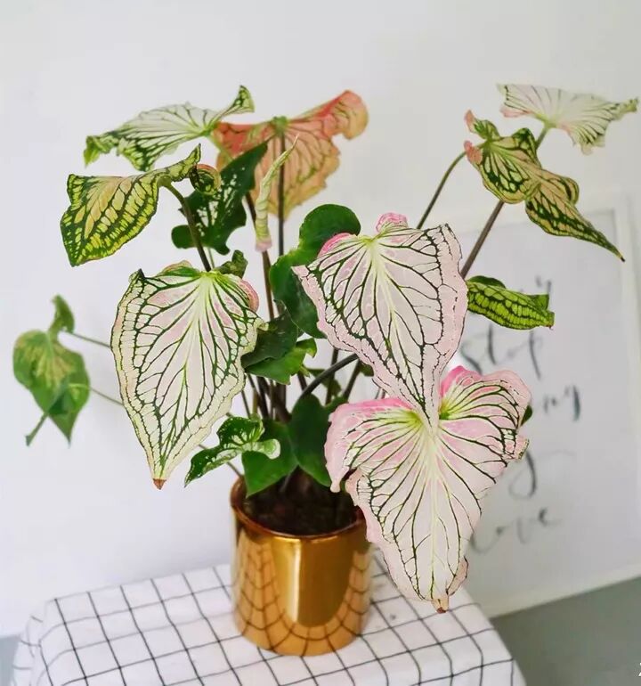 彩叶芋的特点就是叶脉花纹,像艺术画作一样的笔触,每一片叶子的纹路都不相同,放在家里风格独特。