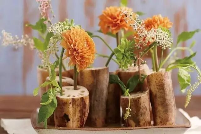 如果说创意,那一定是蔬果插花了,一段莲藕,一颗土豆,一个菠萝……在妙手下,变成一个个最美的景观。