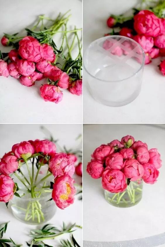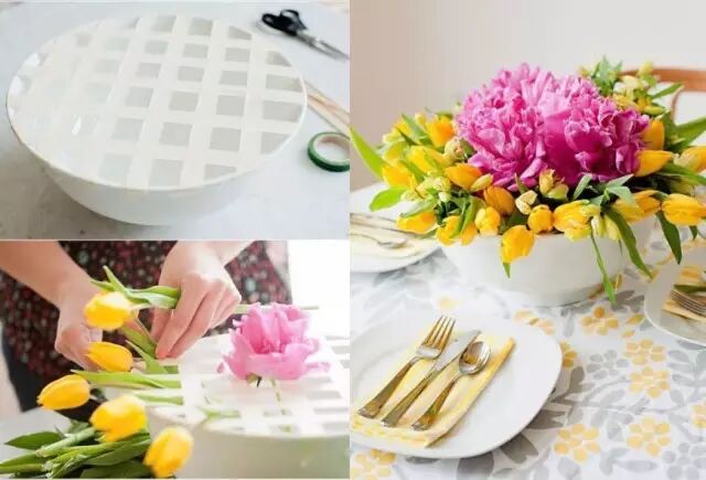 手残星人怕弄不好的话,有种简易的方法,就是用胶布将瓶口分割成格子,再逐一把花插进去,但注意要保持中间高四周低,才能做出完美的弧状哦。