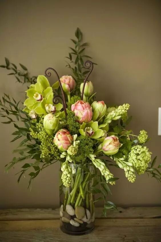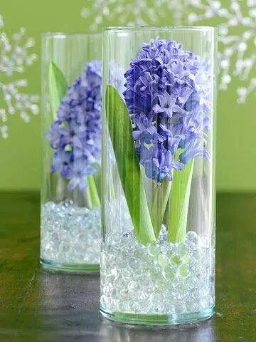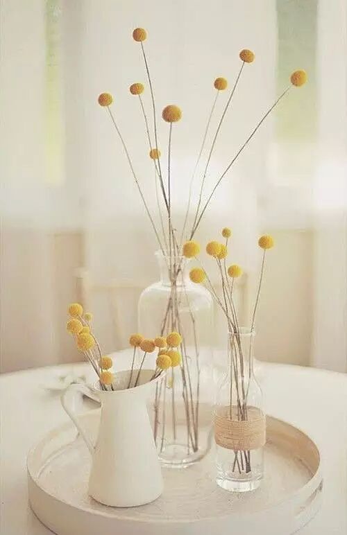 还可以选一些花茎直长的花整个放到花瓶里,用玻璃珠或碎石等固定。