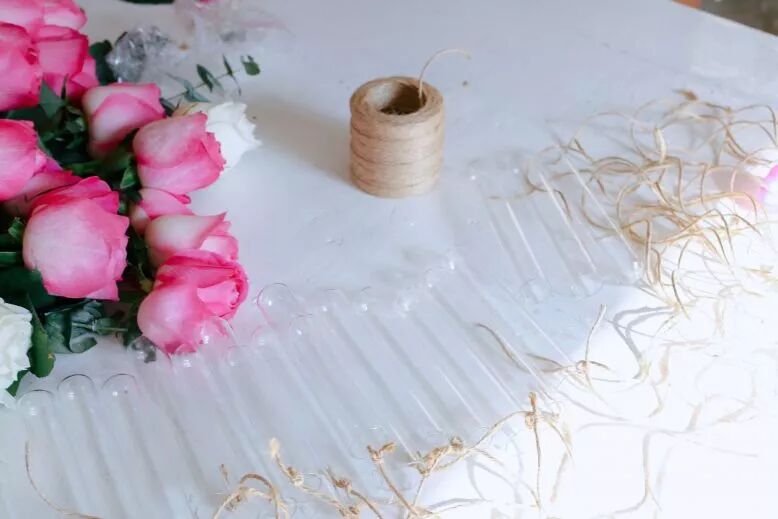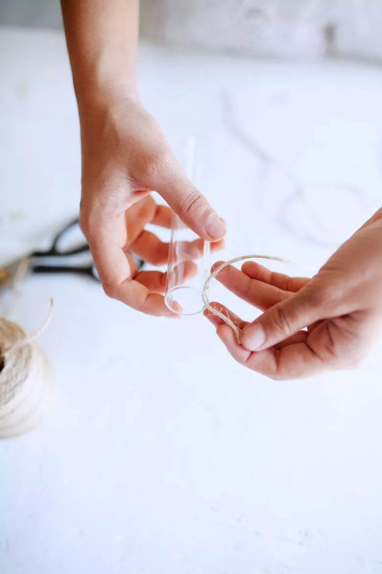 把不同长度的绳子缠到花瓶上。博主选用了小巧细长的试管,大家也可以用小玻璃瓶和罐子替代,注意因为后续还要加水,所以不能选太重的容器。