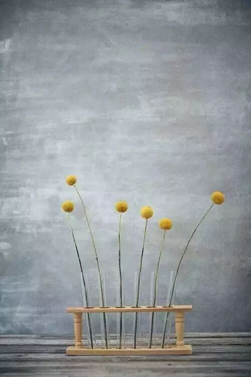 ▲一列试管插花,花材选择枝条自然伸展一类的植物,曾经冰冷的化学实验器也可以开出美丽的小花。