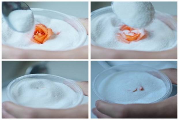 2、把干燥剂轻轻地倒在花朵缝隙之间,倒的均匀点。