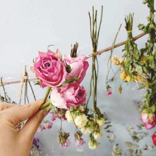 3、每隔几天捆扎一下绳子。因为随着水分散尽,枝茎会变细。不要随意触碰花瓣。3周左右就做好了。