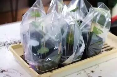 5、再套上塑料袋,盖住花卉,再用橡皮圈套住,让金银花在密闭的环境(温室)下生根,2-3周后揭开塑料袋,会发现土壤略干,根部已抓住土壤;