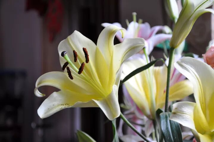 一般去买花都会买几根百合花再搭配一些富贵竹,简单又好看,如果是插在花瓶里水养的话,水不要加太满,不要过吸水点3cm,冬天的话一周换一次水;可以在水里放少量的盐,每天用喷壶朝着花蕊叶子撒一些水,花期可以延长好几天。