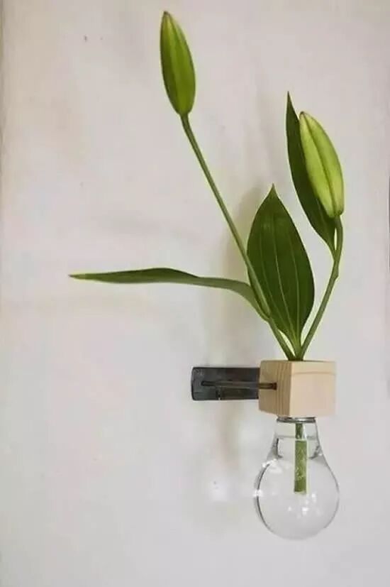 如果想要墙壁上的玻璃花瓶,可以准备一块小木块,挖出孔后把灯泡螺纹部分旋进去,再用配件固定到墙壁上。
