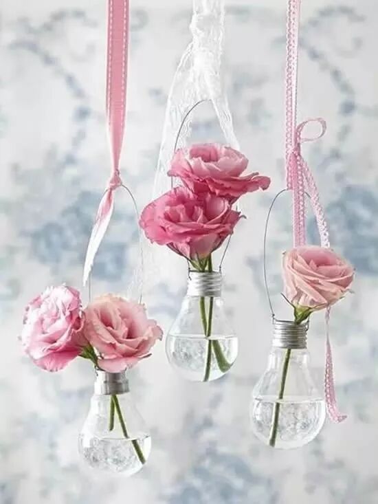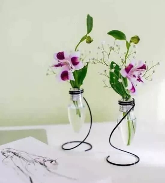 利用灯泡的螺纹,安装上铁丝,再用绳子或丝带挂起来。倒入清水,把鲜花插进去就做好了悬挂式的花瓶。