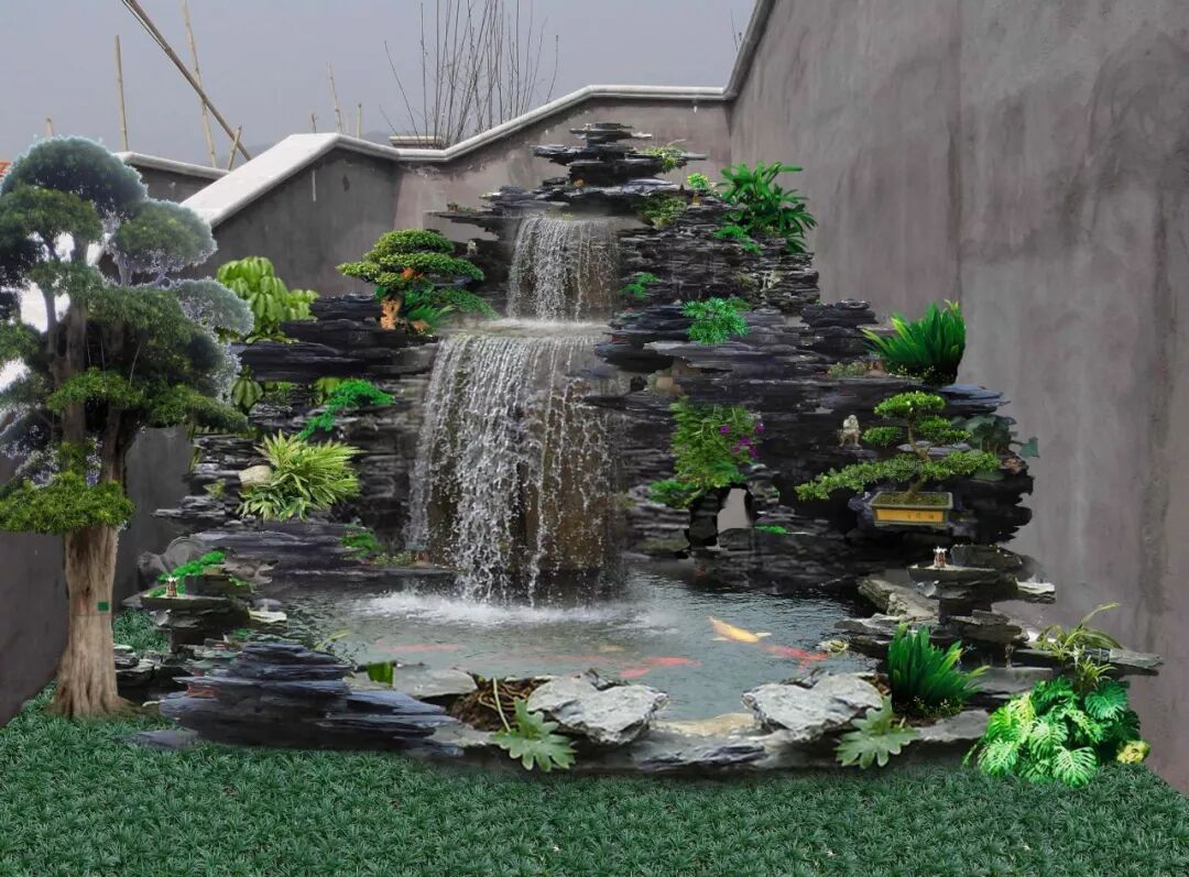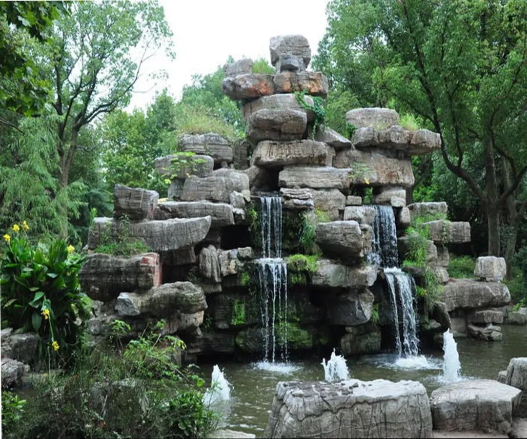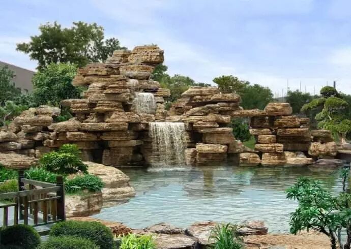 假山是古典园林景观中一个很常用的元素,利用现有的石头进行雕刻,做出假山的造型,配合上水景,很容易就把大自然中的“高山流水”表现出来。