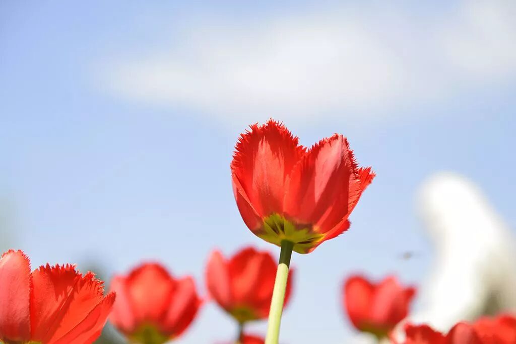 仰视角度:从低于花艺作品主体的位置抬起头来仰视着拍摄,画面效果有夸张高度的作用,空间透视效果更加强烈,另外,通过这种视角拍摄低矮的花朵,往往可以排除背景环境中的杂物,取而代之以简洁的天空为背景,达到简洁画面、突出主体的效果。
