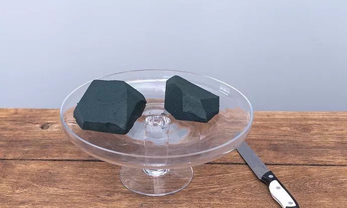 准备花器、去棱角去边的花泥,一大一小的花泥,成八字状放好。