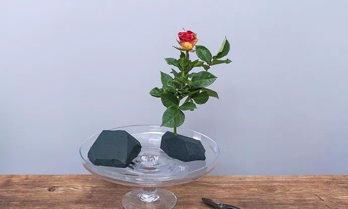 我们选择小玫瑰作为主花材,修剪花材,插入花泥,保留花泥上方两厘米以上的叶子。