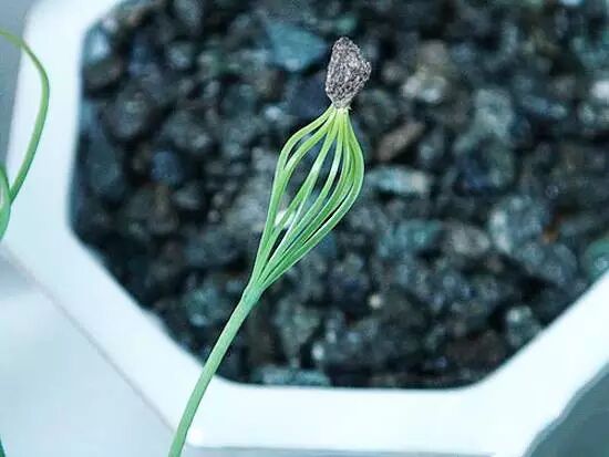 4.半个月后,种子发芽了,小苗顶着外壳向上蹿,尖端的样子有点像打蛋器。
