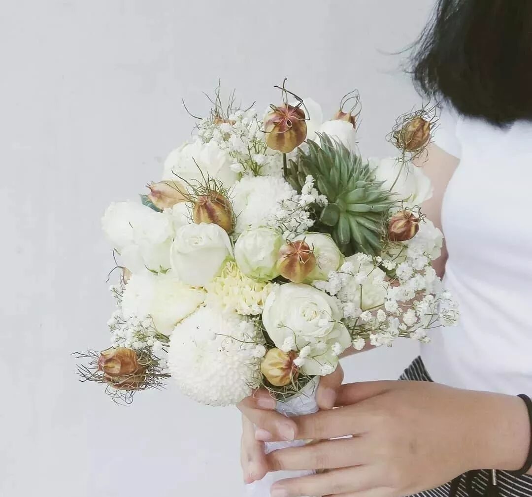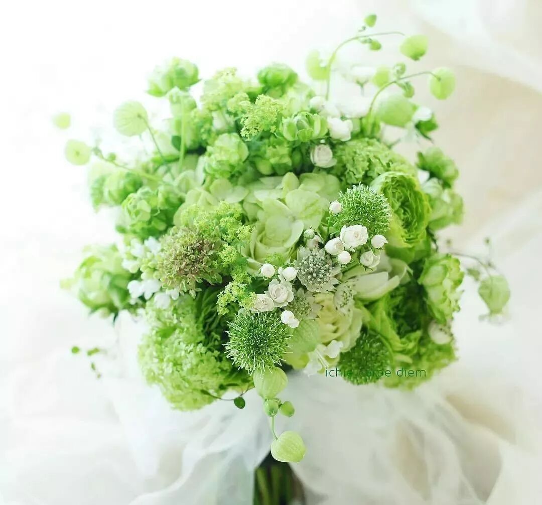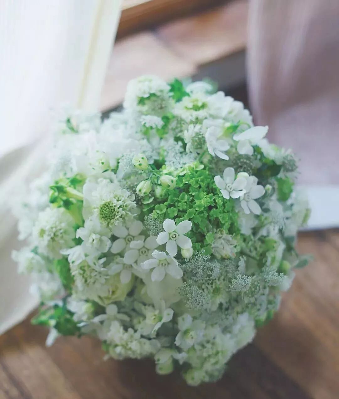 绿色手捧花点缀些白色花材,就有了可爱的感觉,清新又美好。