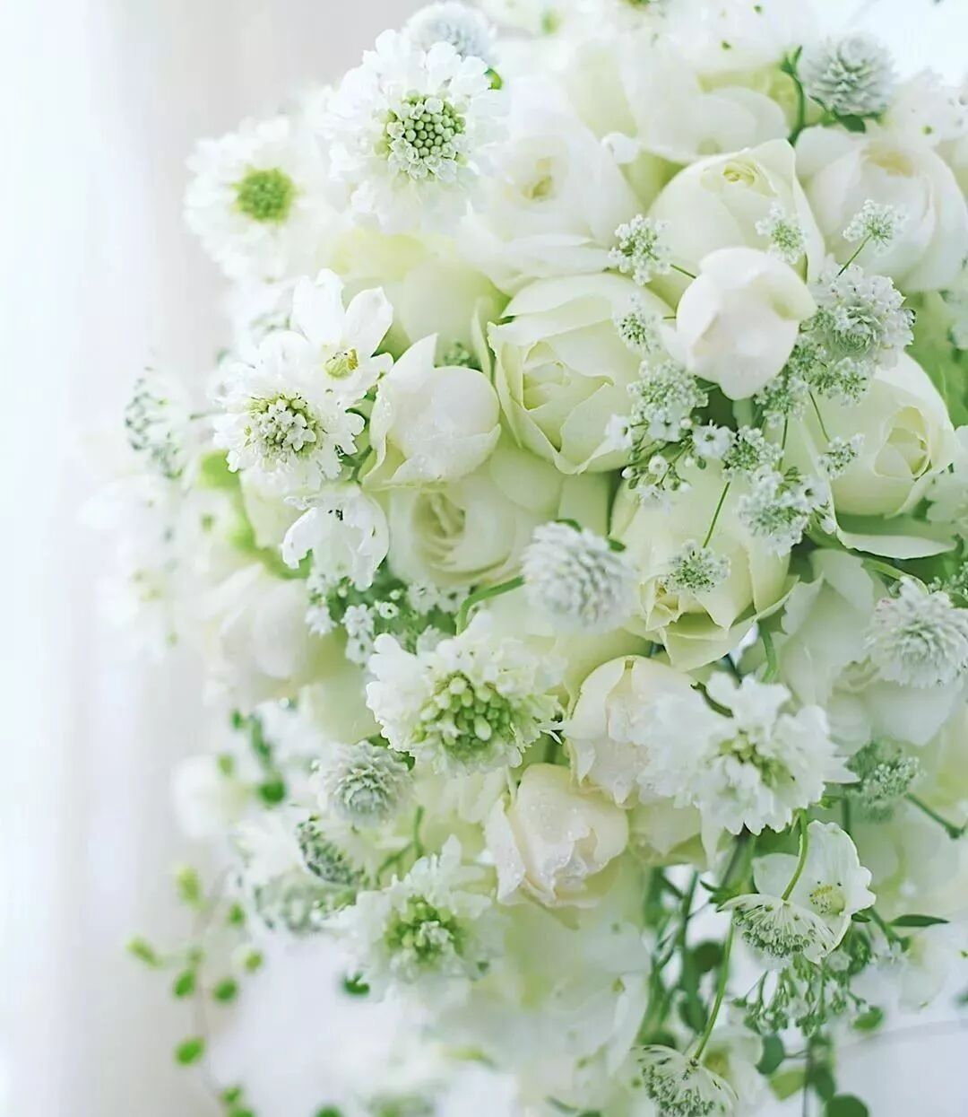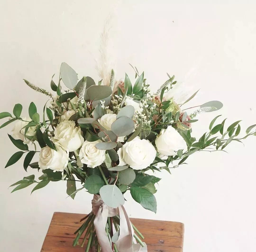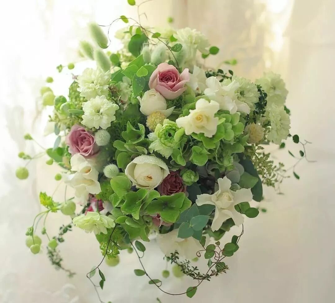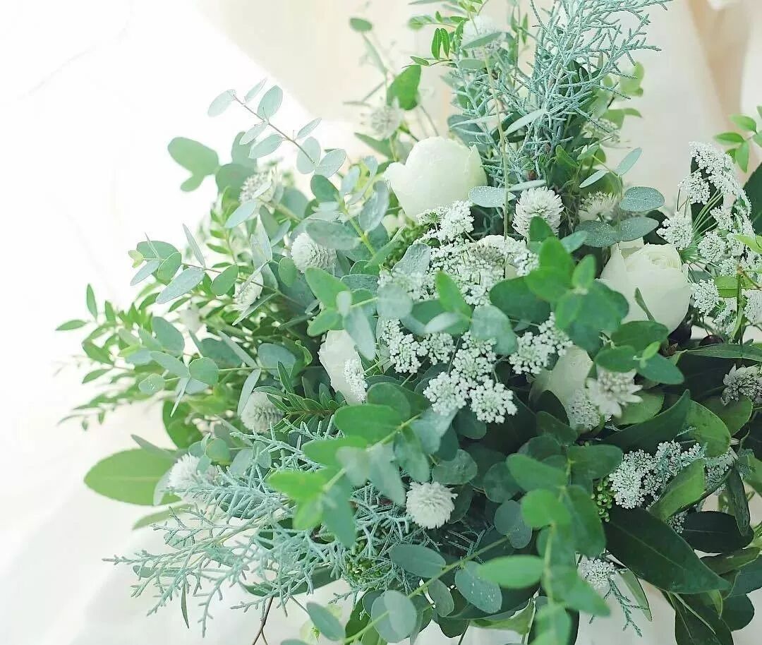 绿色手捧花点缀些白色花材,就有了可爱的感觉,清新又美好。