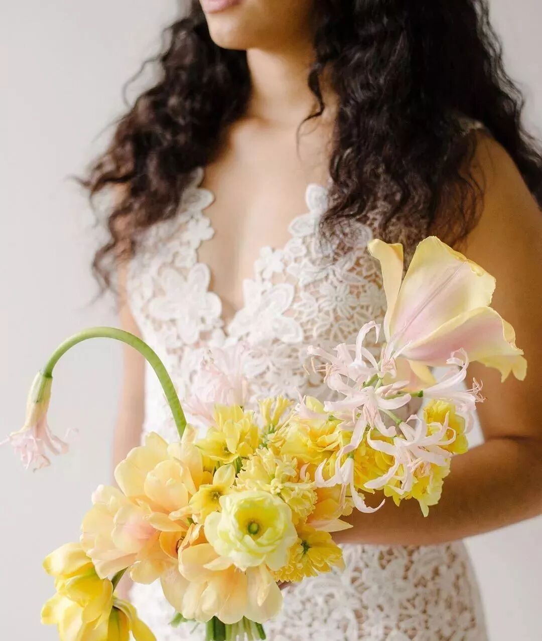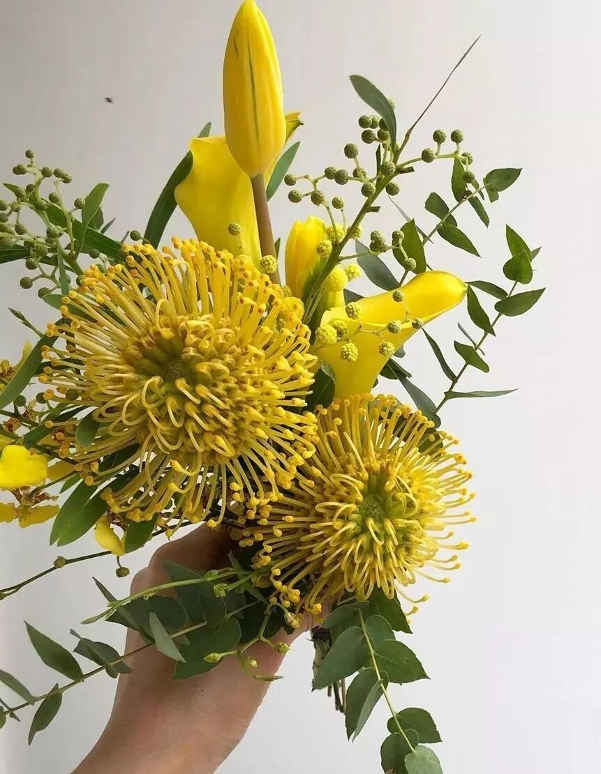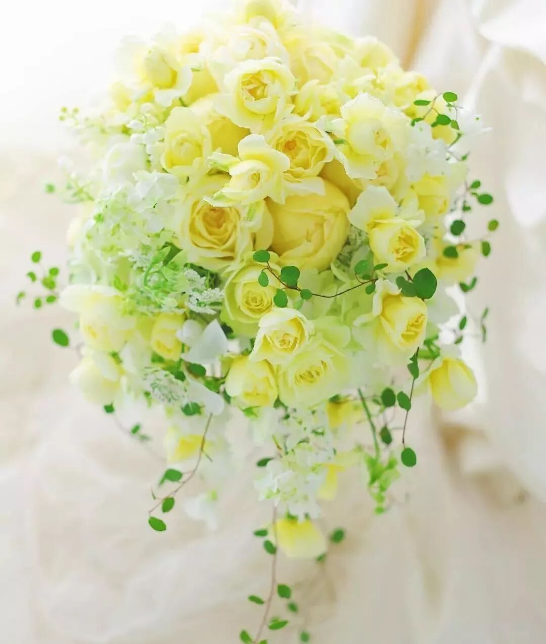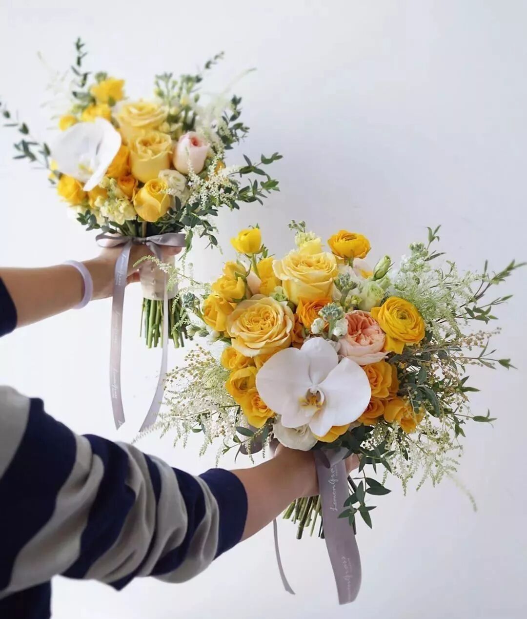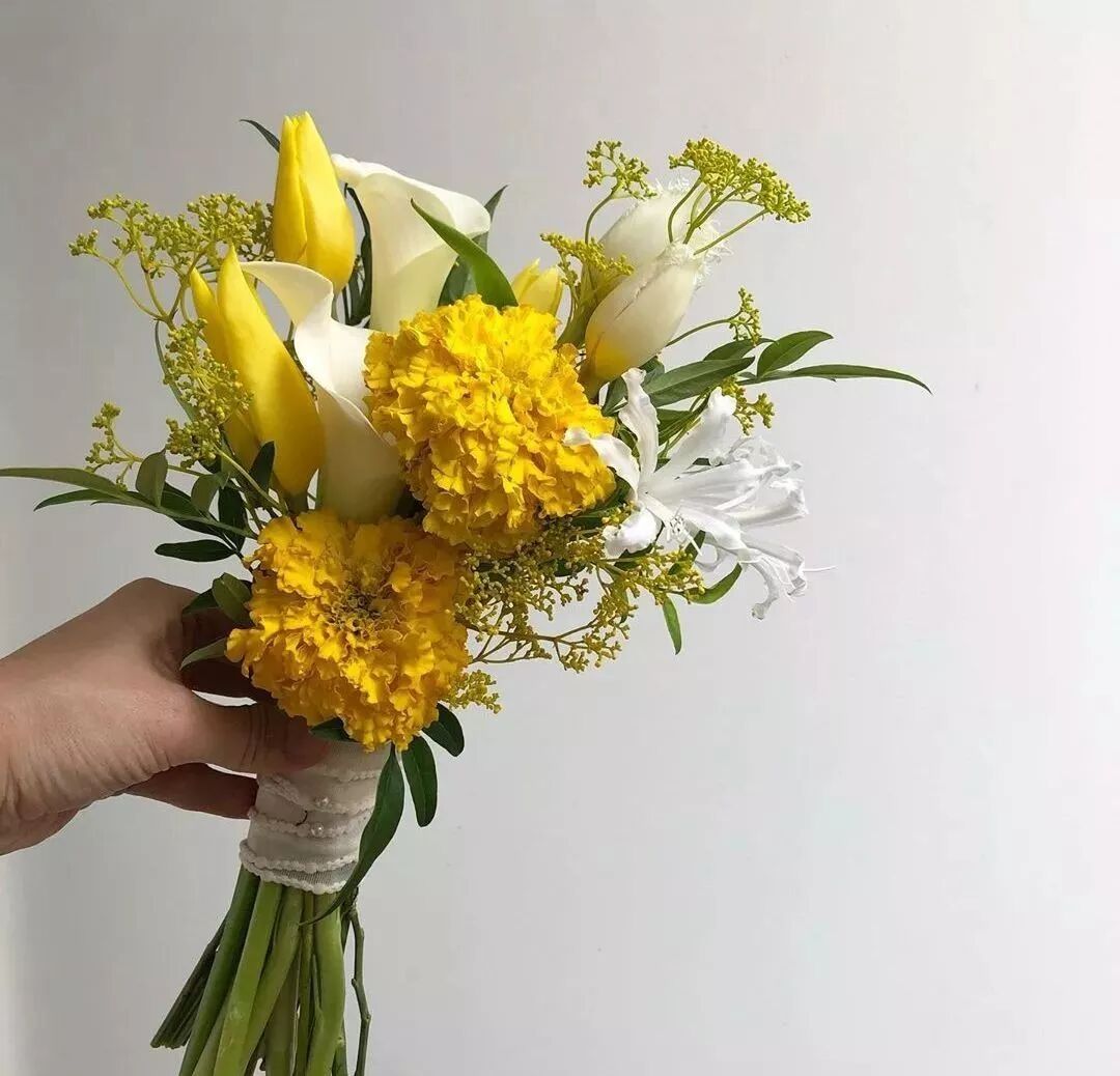 黄色本身就给人一种活泼的明亮感,黄色的手捧花俏皮有活力,中间穿插些白色的花朵点缀就很好看。