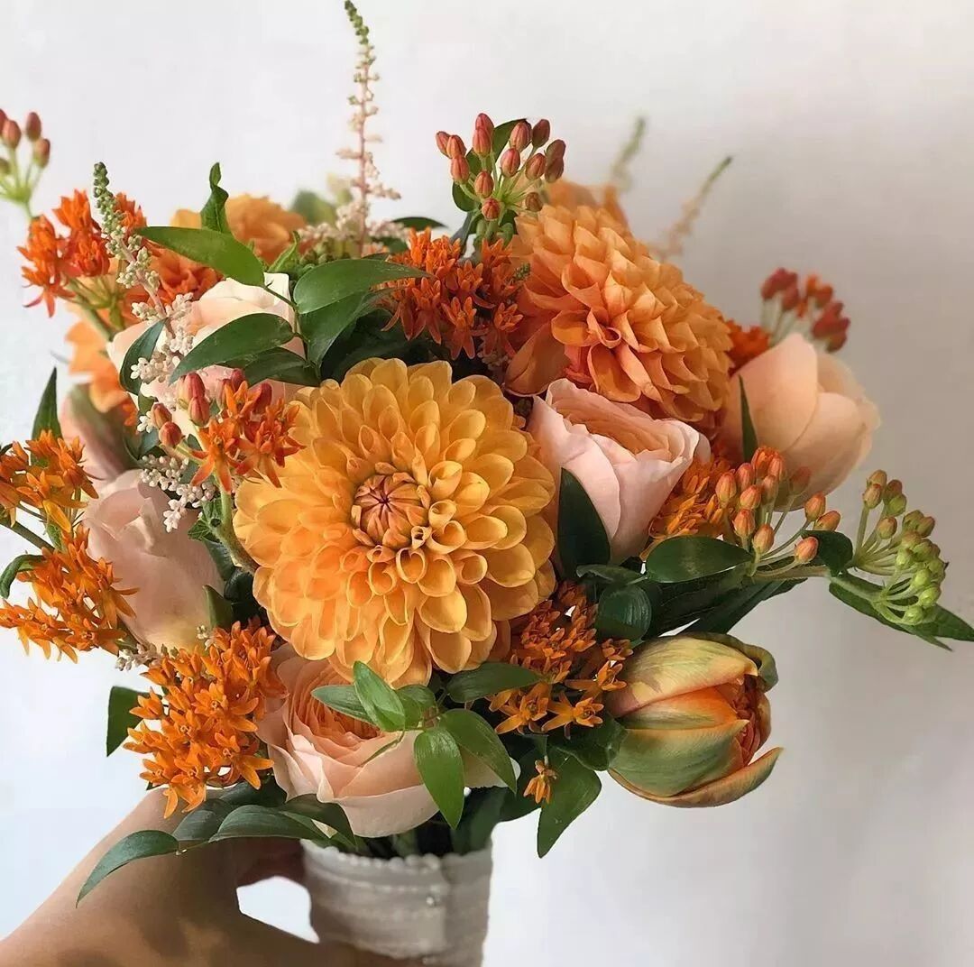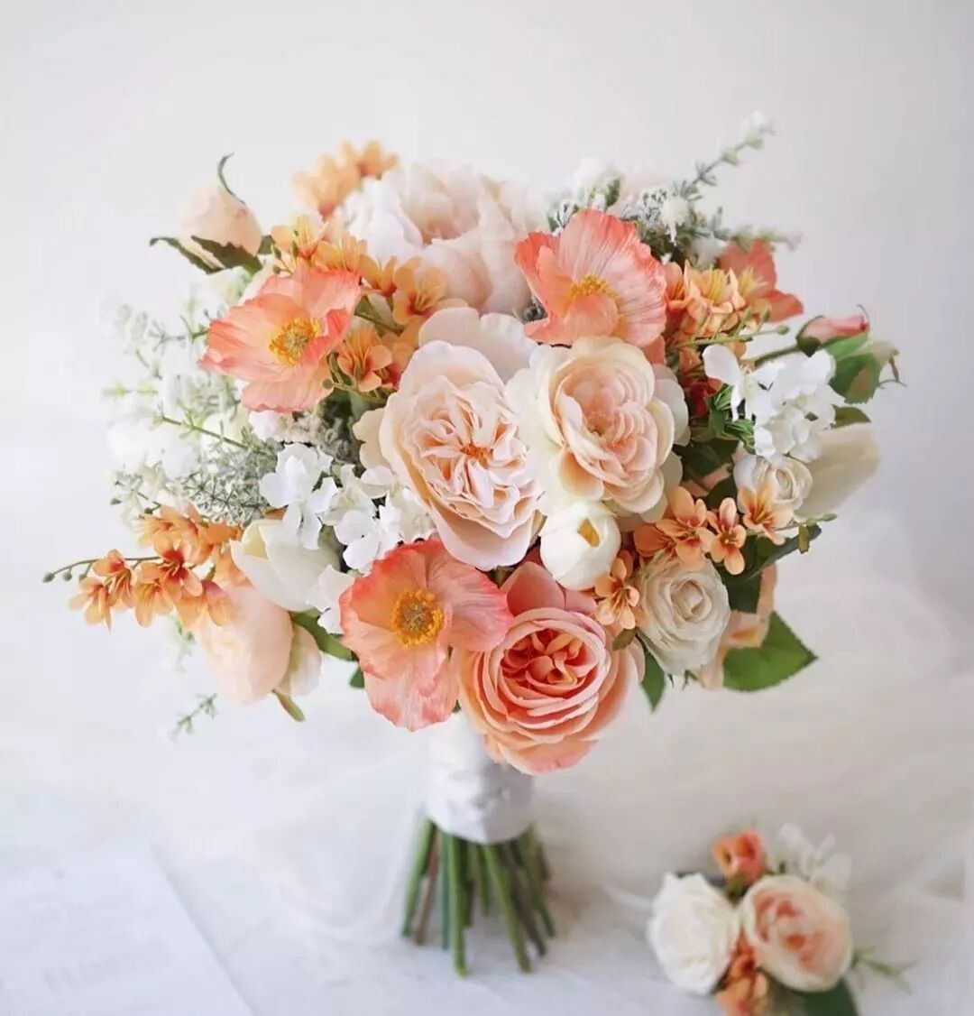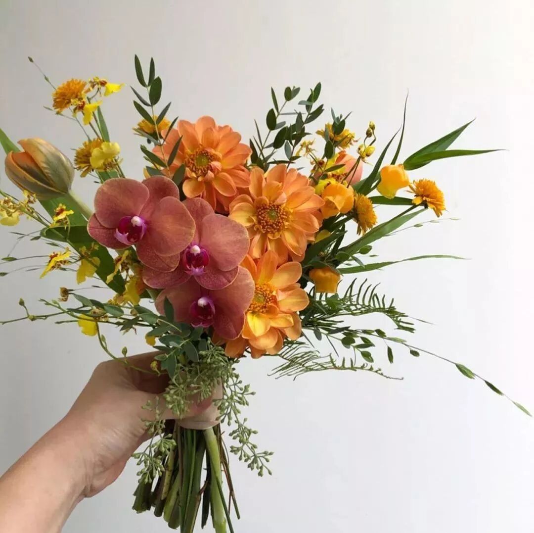 新娘选择橙色的手捧花,混入一些白色或黑色,即为其增加色彩感,同时也会显得更加浪漫。