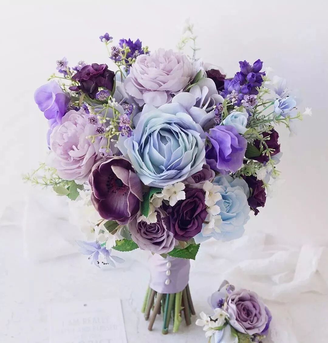 蓝色的手捧花比较适合夏天使用,能够给婚礼带来一丝清凉感。