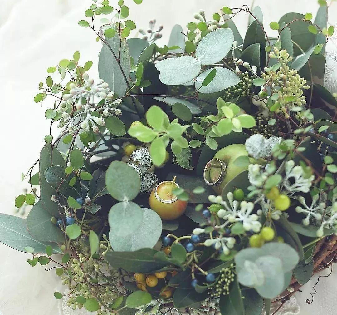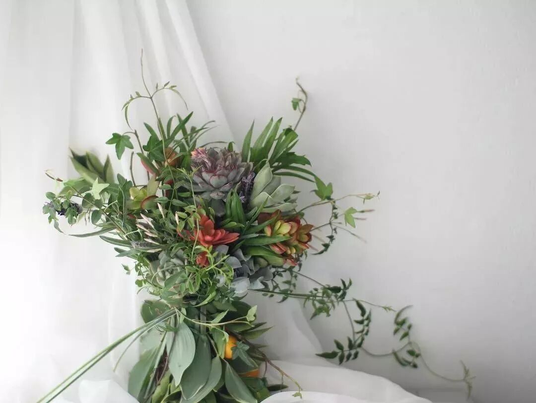 嫌那些大红大绿的花朵太艳俗?如果普通的花朵已经不能满足你对个性婚礼的追求,那么你可以大胆选取其他绿色植物来制作手捧花。