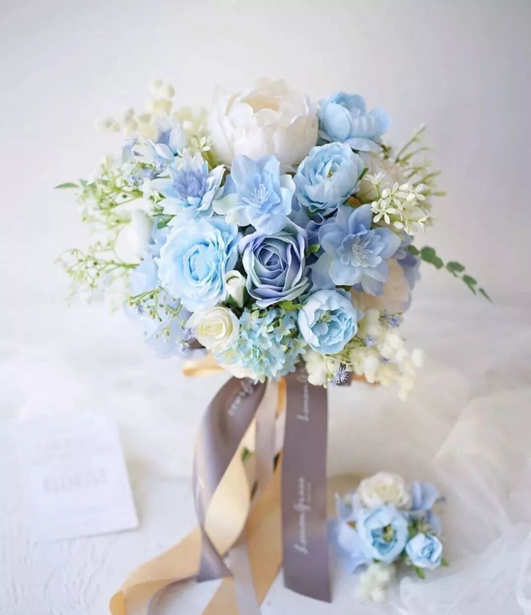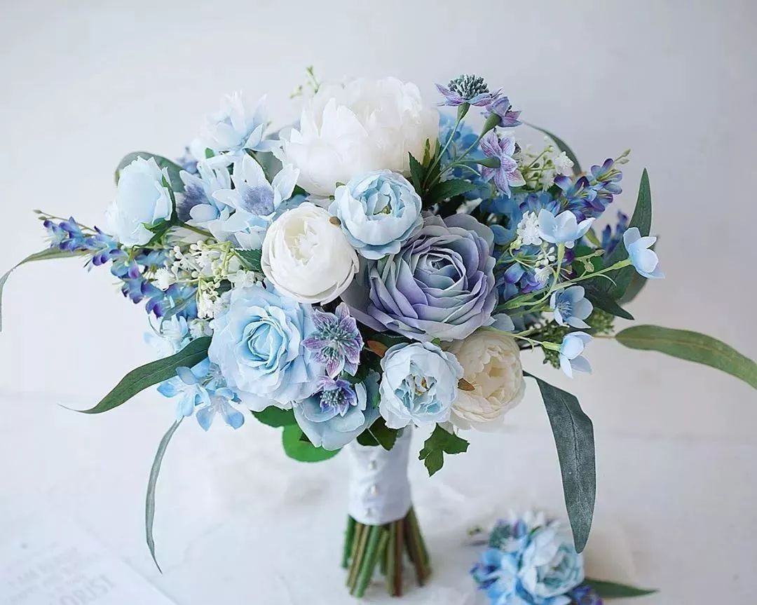 新娘选择蓝色的手捧花可以混入一些纯洁的白色或者亮眼的黄色,这样的色彩搭配与新娘的白色婚纱相互映衬,美丽又奇妙。