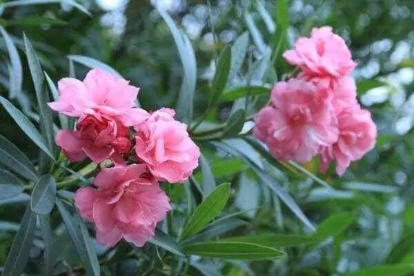 夹竹桃的叶片如柳似竹,红花灼灼,胜似桃花,花冠粉红至深红或白色,有特殊香气,是有名的观赏花卉。除此之外,夹竹桃有抗烟雾、抗灰尘、抗毒物和净化空气、保护环境的能力。但是需要注意的是,夹竹桃的叶、树皮和花等含有多种配醣体,毒性极强,人畜误食能致死。
