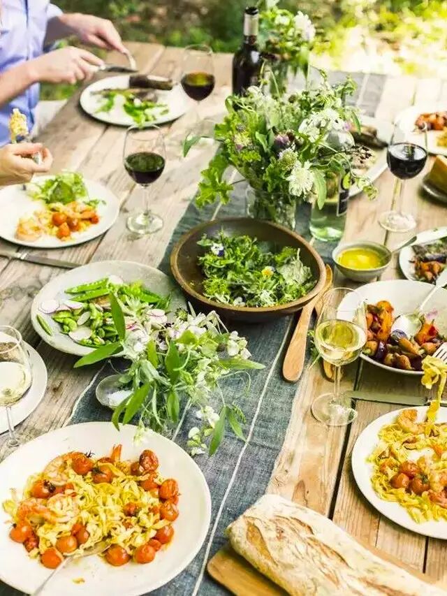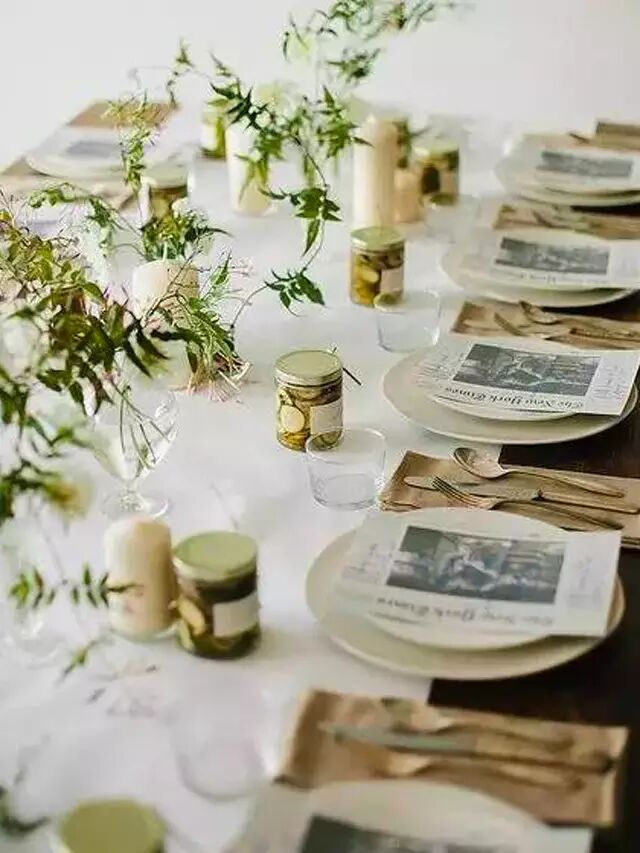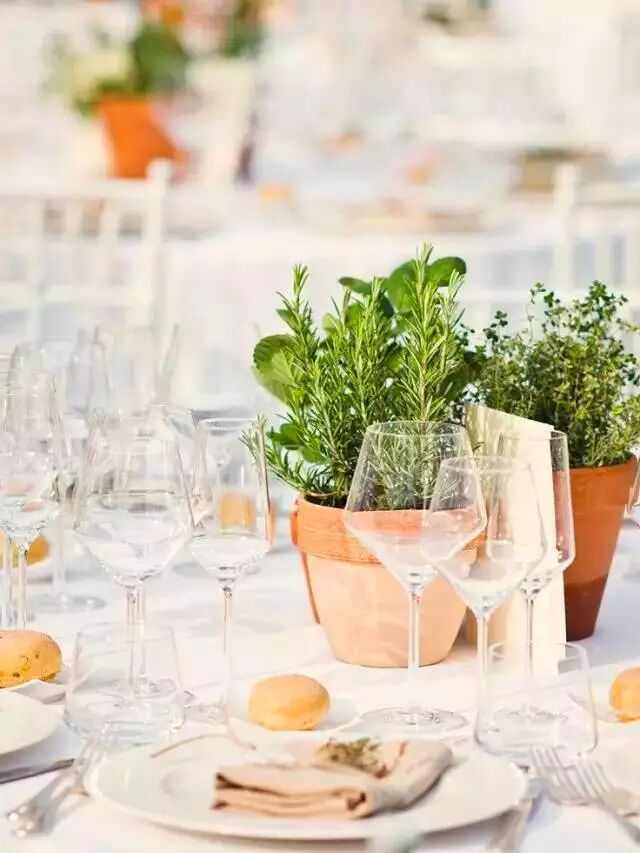 小型绿色植物或开花植物连花盆一起摆在餐桌上也很美,非常自然清新的感觉,尤其适合院子里的餐聚。