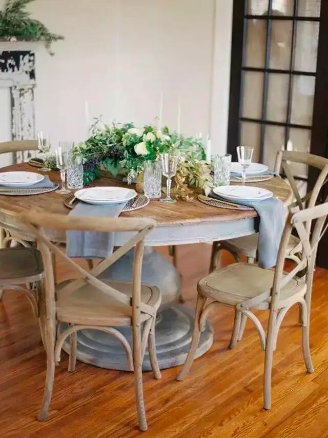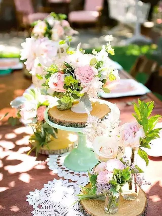 如果是圆桌,可以以圆心为点,摆放一个插花,或者摆一组高低不同的玻璃器皿,在其中插上鲜花,要点就是从各个角度看上去,都一样好看。