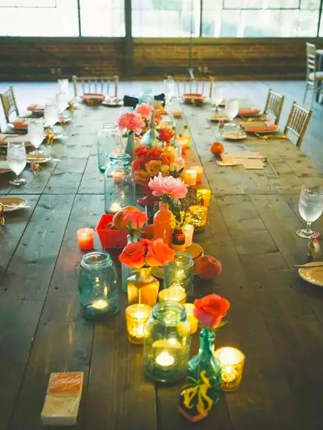 ▲ 看上去有很多元素,但最主要的元素是插着鲜花的小花瓶、广口瓶盛放的蜡烛和小茶蜡杯。这三个要素穿插反复,不求工整,但节奏保持平稳。