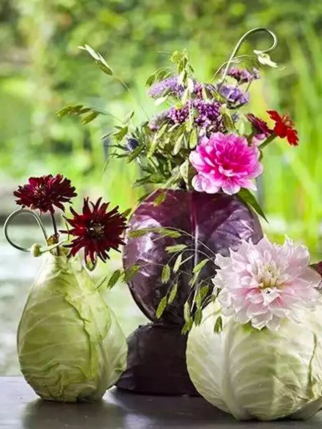 ▲ 把菜当中挖一个洞洞,里面填上花泥,卷心菜就成了有趣的花器。