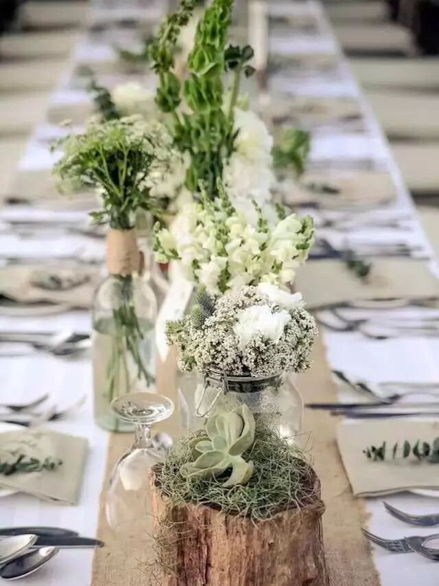 如果是长桌,需要摆放一组以上的花,那可以重复一个主题:也许是一个简单的花瓶,里面插满雏菊,也可以是一组两三个玻璃瓶,每个里面有一两支花,让长长的桌面保持节奏,是最重要的。