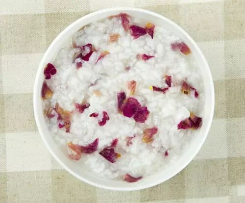取阴干玫瑰花瓣10克。先以粳米80克、枸杞子15克、大枣10枚、芝麻1 5克煮粥,煮数沸后,加入玫瑰花再煮至粥熟软,然后加白糖适量,食粥。此粥经常食用有防衰抗老、驻颜美容之效。
