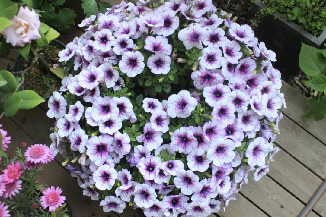 遇到长得胖嘟嘟、整个身体盖住花盆口的矮牵牛,需要扒拉一下她的身体,把水浇到土壤里。