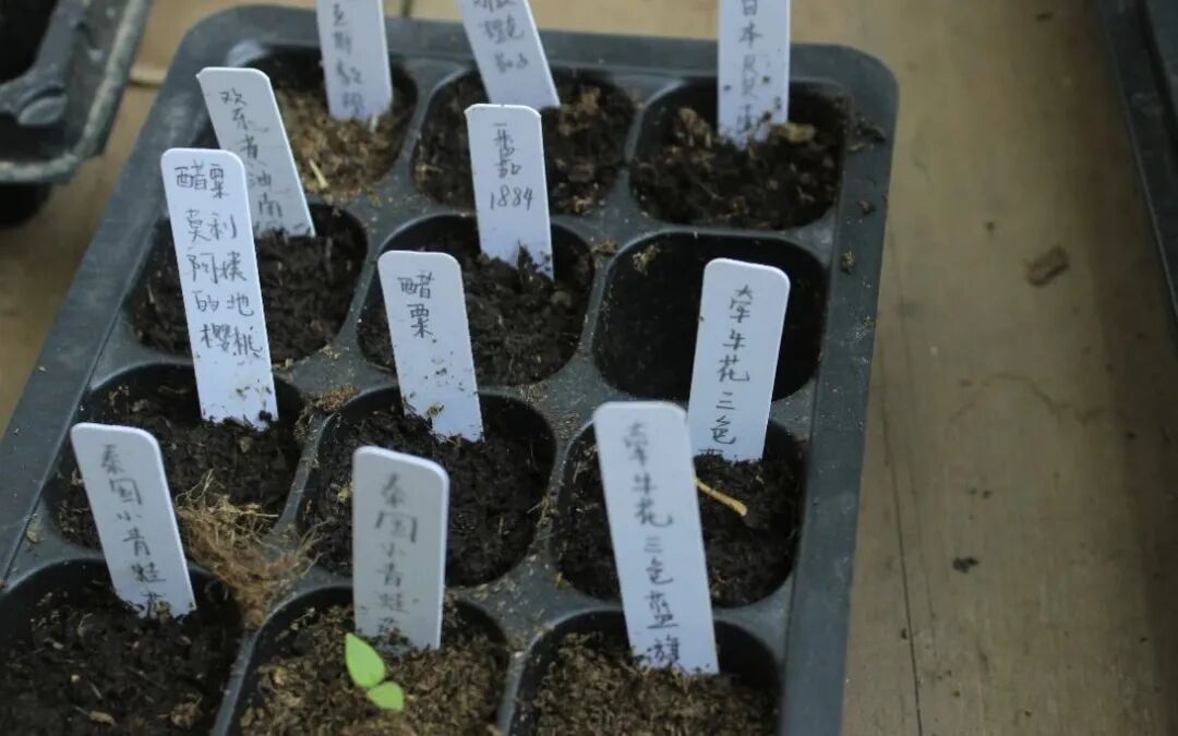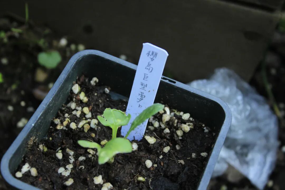 花园一角的育苗盆里,还静静生长着矮生豌豆、樱岛巨型萝卜、玻璃宝石玉米、巡洋舰香菜、泰国小青蛙茄……