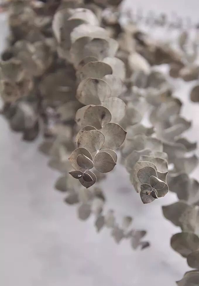 尤加利叶就是桉树的叶子,桉树的品种非常多,形态各异。用作鲜切花的品种也不少。干燥的尤加利依然有独特的清冽味道。叶子的颜色变成更浅的灰绿色。