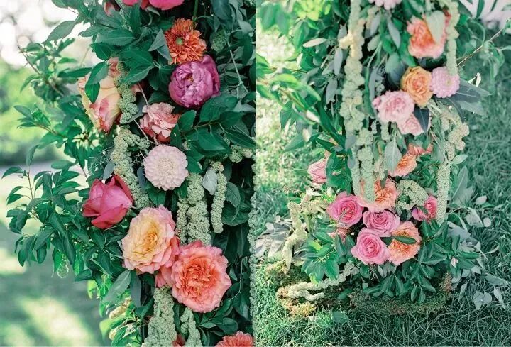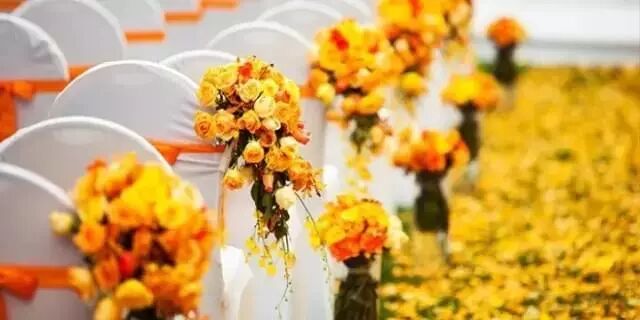 在婚礼中即使用同一种的不同深浅变化的花材进行搭配,如橙色单色系的搭配,渐变粉色的搭配等,此类色彩搭配柔和单纯,表现出优雅热情的气质。