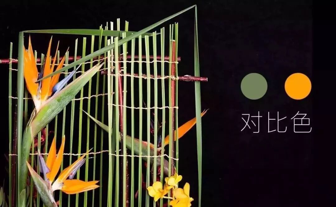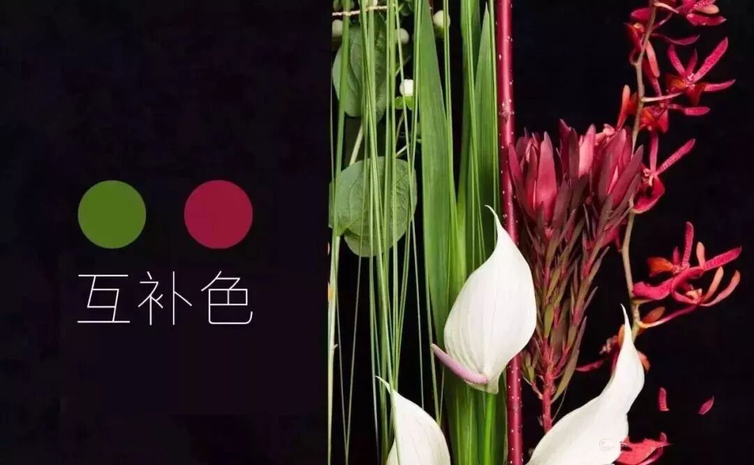 12色轮中呈180度位置的两种颜色为互补色,为什么觉得有的花艺看起来辣眼睛,很可能在色彩上采用了互补色的不合理搭配,俗话说:红配绿,赛XX(嗯,你们都懂的)。诸如此类,但并不是所有的互补色搭配都会丑,不是还有句话说:“红花虽好,还需绿叶来扶持”吗?按理说,绿色作为自然色在花艺设计中可以和任何色彩组合,但想把互补色做出高质量的作品,还要涉及到色彩、纯度、明暗度和比例等问题,多元素考虑之后,会呈现多重效果。