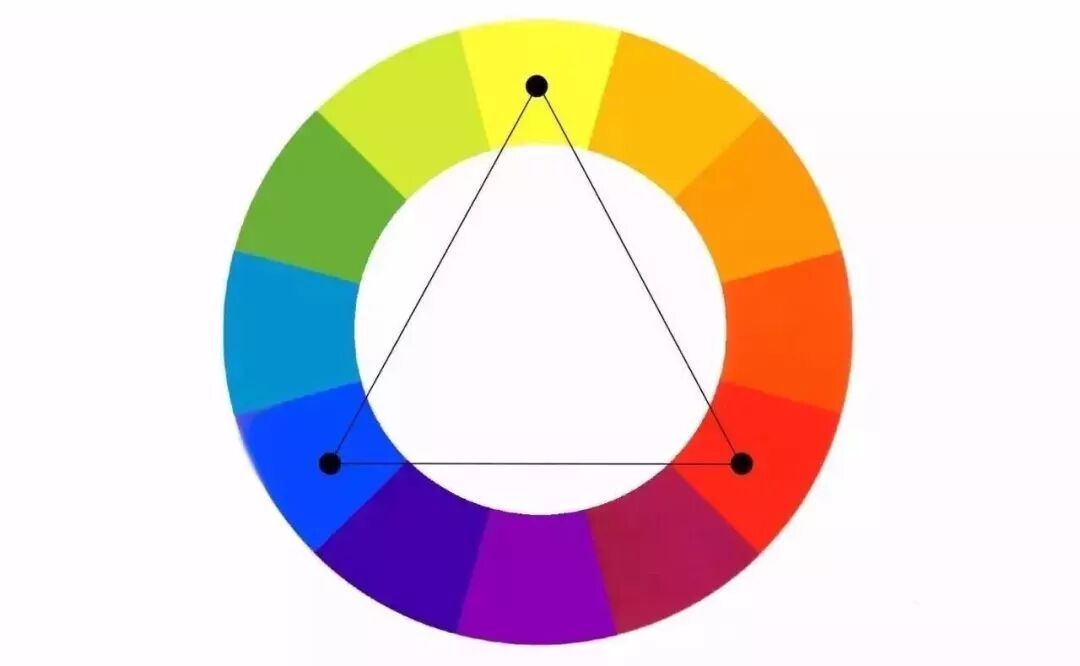 在色环上刚好构成等边三角形的三个颜色搭配在一起称为三角配色,如,红黄蓝三色,橙色、紫色和绿色三色等都属于三角配色,是非常明朗、强烈、活泼的颜色组合方式。