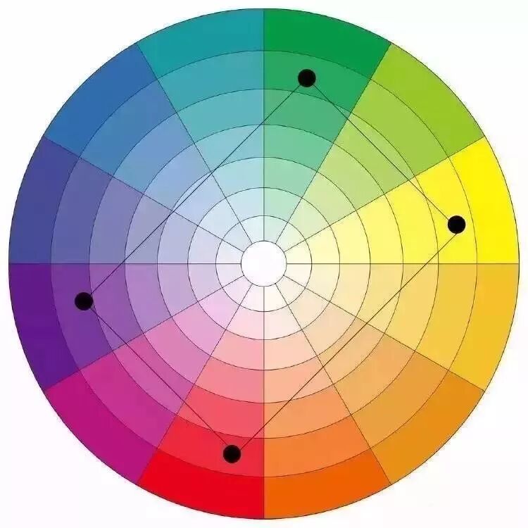 在色环上包含很多相邻色彩,而且颜色跨度非常大的配色方法。如,使用得当他能给人奢华、艳丽的色彩效果,令人感到世界的丰富多彩。