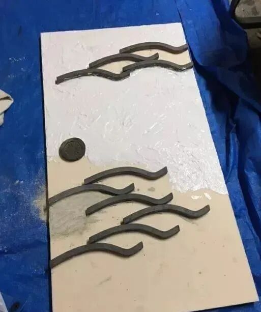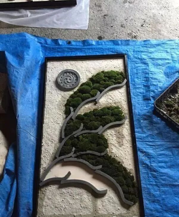 将切薄的瓦片粘在上面固定成云海和树木的造型。