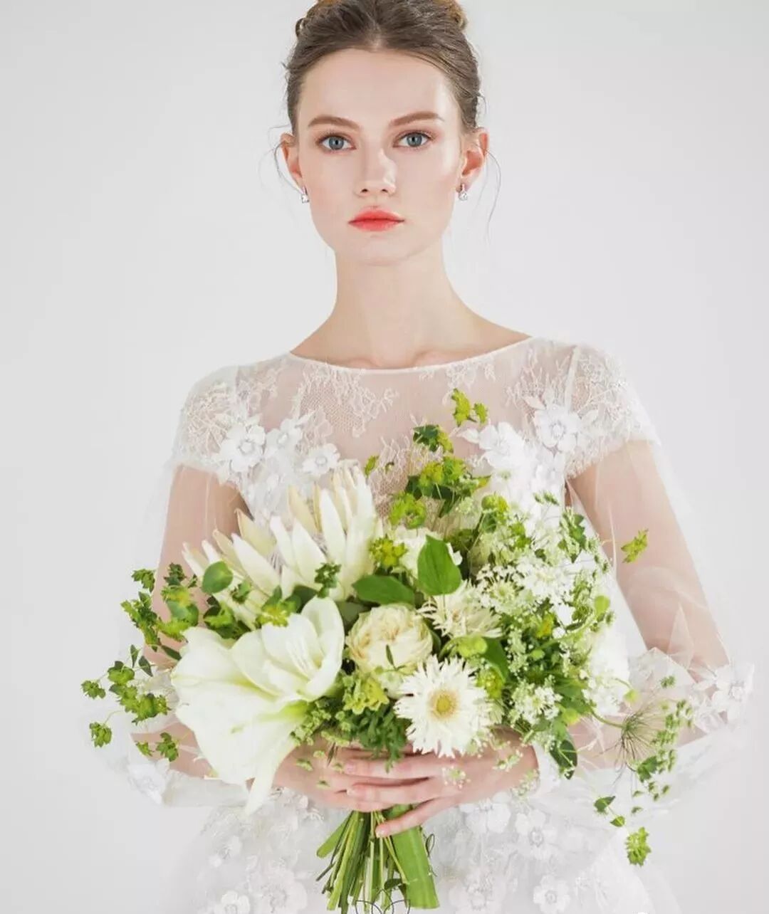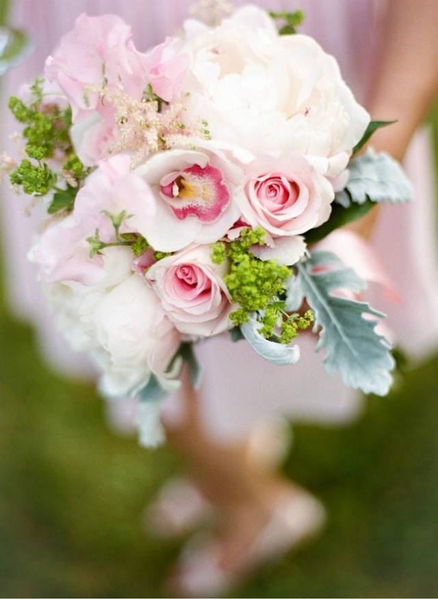 4、身材娇小的新娘不太适合太长、太大的捧花,否则就会显得头重脚轻,选择圆形或球形花束会比较合适。