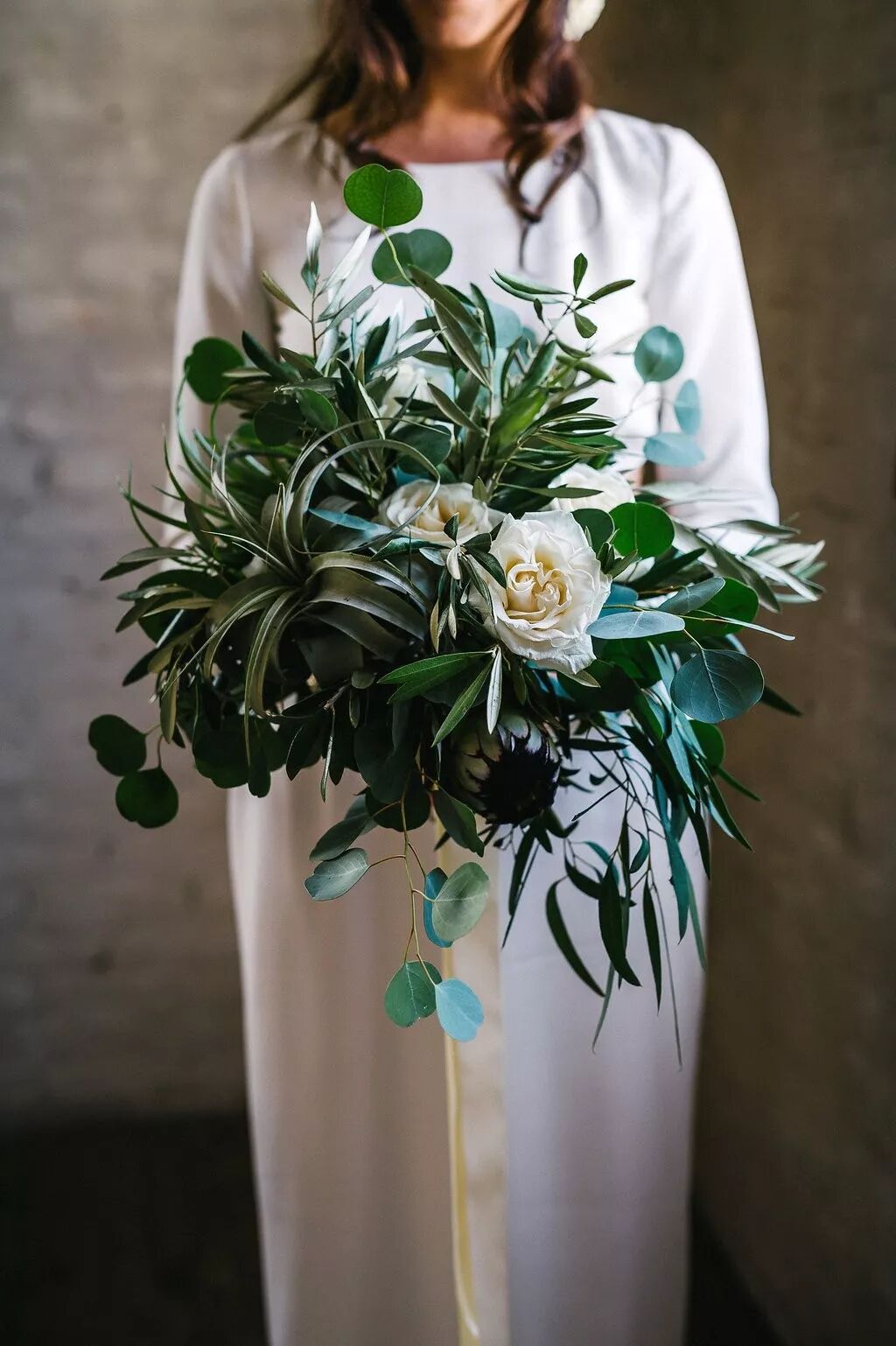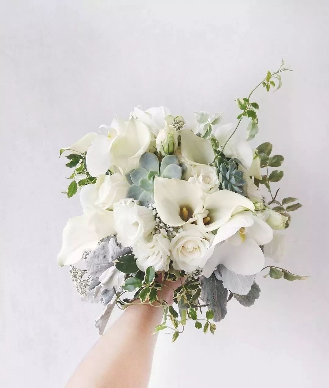绿色:嫌那些大红大绿的花朵太艳俗?如果普通的花朵已经不能满足你对个性婚礼的追求,那么你可以大胆选取其他绿色植物来制作手捧花。