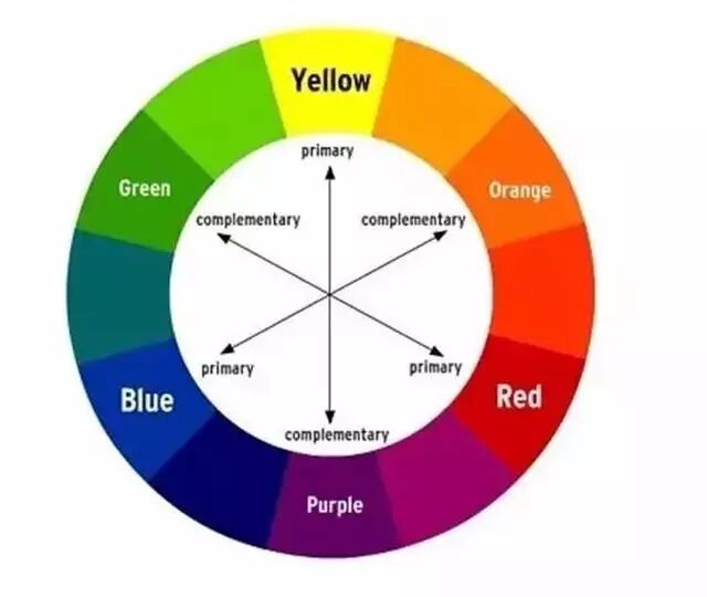色以某一颜色为基准,与此色相间隔120°—150°的任一两色互为对比色。比如红和蓝、蓝与黄等。